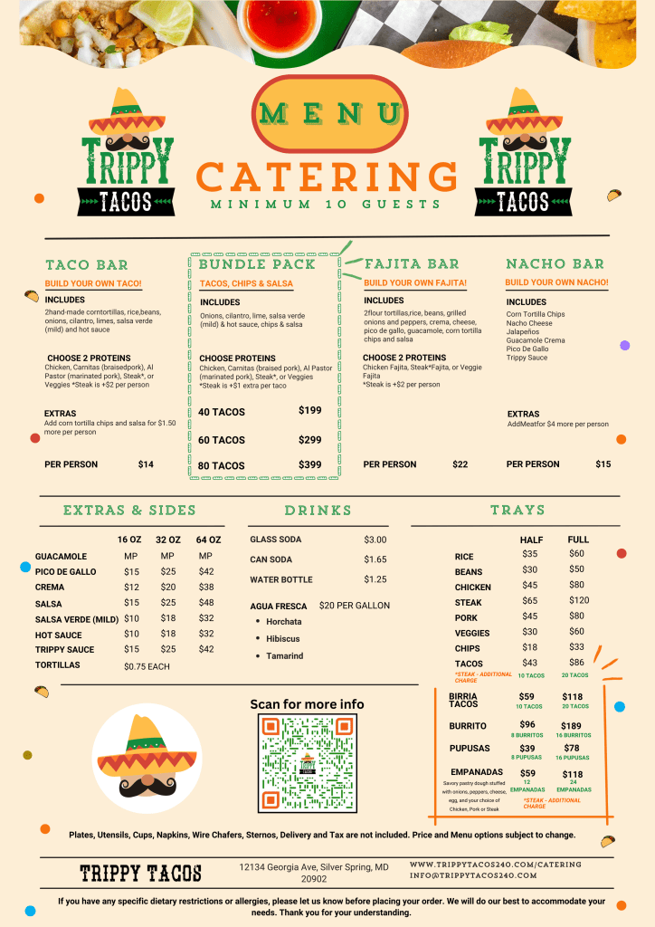 “My wife and I recently organized a graduation party for two of our children who were finishing grad school. We decided to have food for the 17+ people attending the party catered by Trippy Tacos. We were very happy with everything. The staff were very professional and helpful in figuring out the right amount of food to order. The food was delicious (excellent fajitas and pupusas!!), and it was a ready on time — hot, well prepared, and well packaged. The cooks and servers were super friendly and helpful when we came to pick up the food. Our guests were very pleased with the spread, and many asked where we ordered the food from, so they could visit Trippy Tacos on their own!”